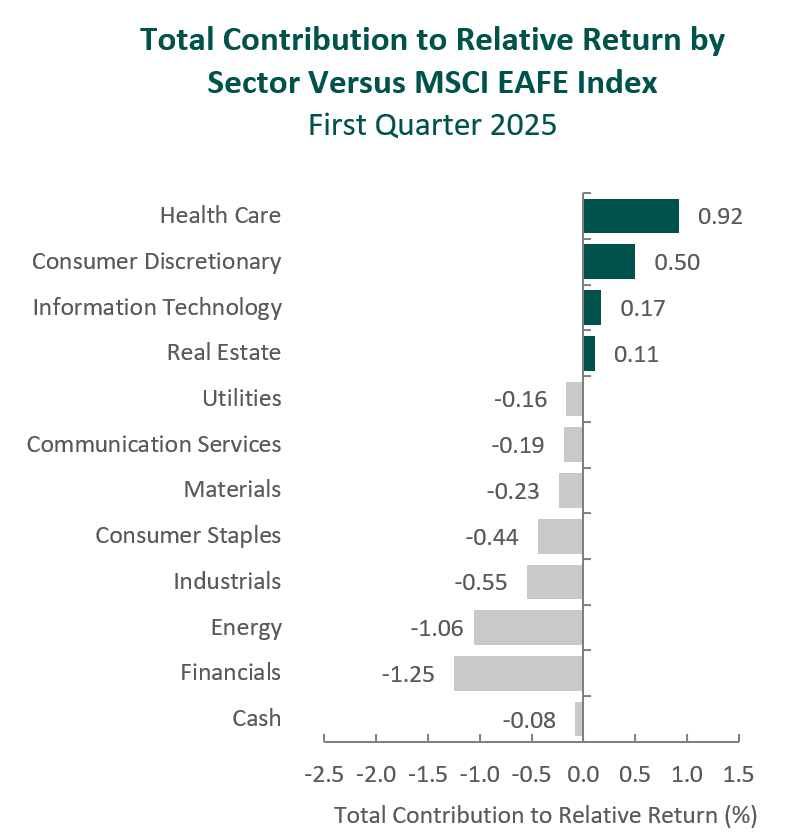 From a sector perspective, the portfolio’s underperformance relative to the MSCI EAFE Index can be attributed to both security selection and allocation effects. Security selection in Energy, Financials and Industrials detracted the most from the portfolio’s relative performance. Conversely, security selection in Health Care and Consumer Discretionary, as well as an underweight in Information Technology, contributed to relative returns.