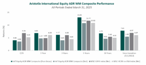 *The inception date for the International Equity ADR WM Composite is 7/1/2012. As of 1/1/2024, the composite was renamed from the International Equity ADR Wrap Composite. Past performance is not indicative of future results. Aristotle International Equity ADR WM Composite returns are presented pure gross and net of the maximum wrap fee and include the reinvestment of all income. Pure gross returns do not reflect the deduction of any trading costs or other fees and are supplemental to the net returns. Net returns are calculated by subtracting the highest applicable wrap/SMA fee, which includes trading costs and custodial fees, from the pure gross composite return. (From inception to 12/31/2015, the highest applicable wrap/SMA fee is 3.00% on an annual basis, or 0.75% quarterly. From 1/1/2016 to 12/31/2023, the highest applicable wrap/SMA fee is 2.00% on an annual basis, or 0.50% quarterly and 0.17% monthly from 1/1/2024 to present.) Aristotle Capital Composite returns are preliminary pending final account reconciliation. Please see important disclosures at the end of this document.