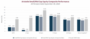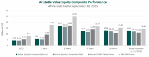 For the third quarter of 2025, Aristotle Capital’s Value Equity Composite posted a total return of 4.36% gross of fees (4.24% net of fees), underperforming the 5.33% return of the Russell 1000 Value Index and the 8.12% return of the S&P 500 Index. Please refer to the table for detailed performance.