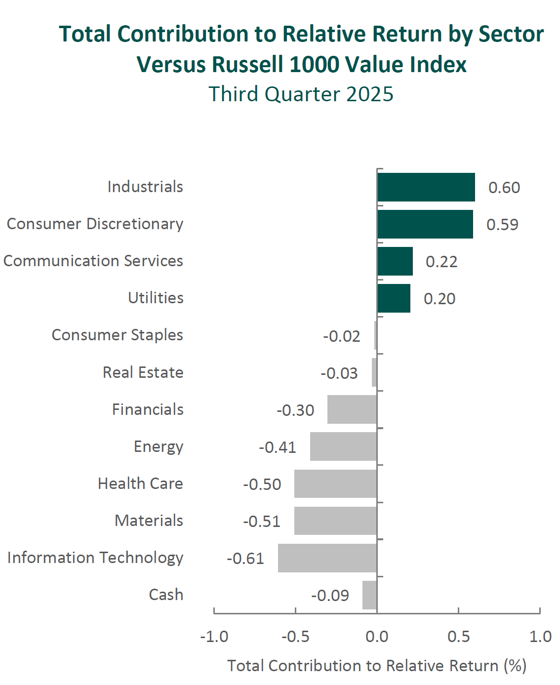 The portfolio’s underperformance relative to the Russell 1000 Value Index in the third quarter can be attributed to security selection, as allocation effects had minimal impact. Security selection in Materials, Information Technology and Health Care detracted the most from relative performance. Conversely, security selection in Consumer Discretionary, Industrials and Communication Services contributed. (Relative weights are the result of bottom-up security selection.)
