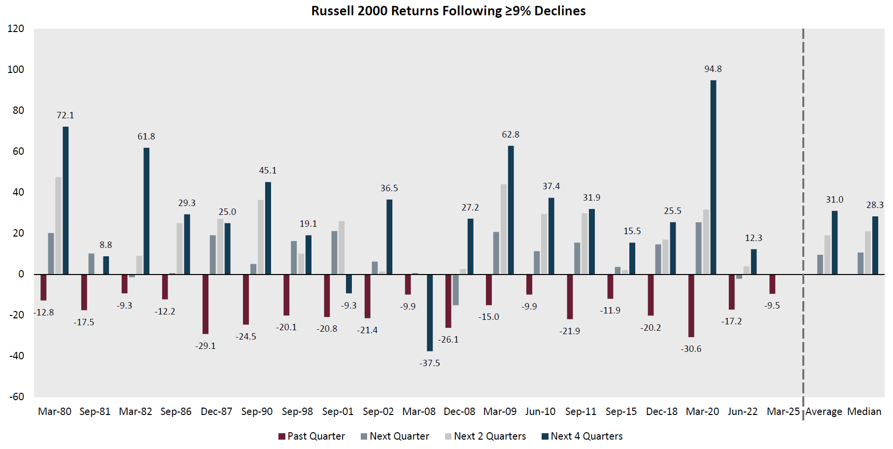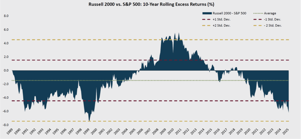 Source: eVestment. The 10-Year Rolling Excess Return represents the annualized return of the Russell 2000 Index over the trailing 10-year period minus the annualized return of the S&P 500 Index over the same period. Rolling periods are calculated monthly based on trailing 10-year return data for these indices from 1979 to March 2025. Past performance is not indicative of future results.