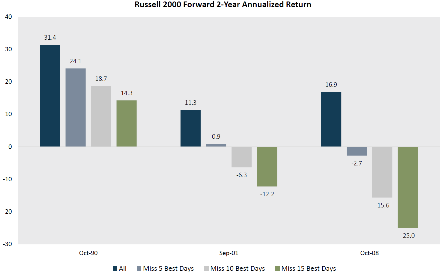 Source: [Left chart]: Furey Research Partners; FactSet. Based on the annualized returns of the Russell 2000 and S&P 500 indices from 1979 to December 2024. [Right chart]: Furey Research Partners; FactSet. Historical returns prior to 1979 represent the Ibbotson SBBI US Small Cap Stocks and the Ibbotson SBBI US Large Cap Stocks indices. Past performance is not indicative of future results..