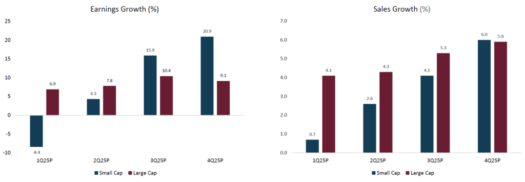 Small cap stocks are attractive relative to large cap stocks across most valuation metrics with value being more attractive than growth. A reacceleration of earnings and sales growth should trigger a new small cap cycle. See our full small cap observations for deeper insights.