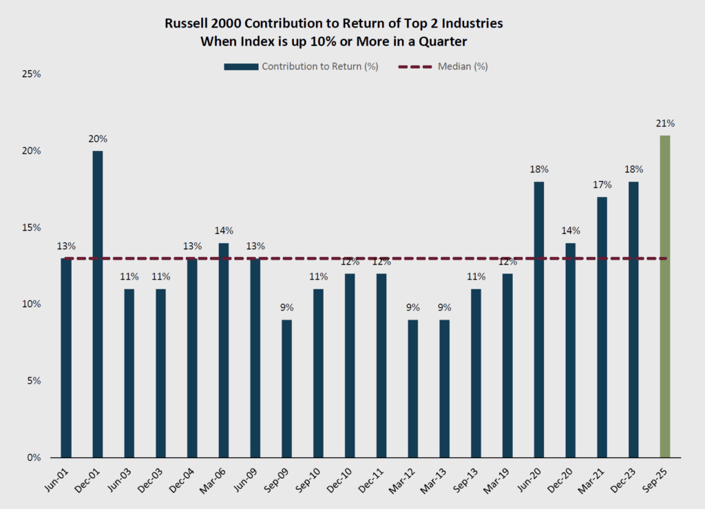Market concentration surged in Q3: just two industries—Metals & Mining and Semiconductors—drove over 20% of the Russell 2000’s total return. Metals & Mining climbed 56%, Semiconductors 39%.