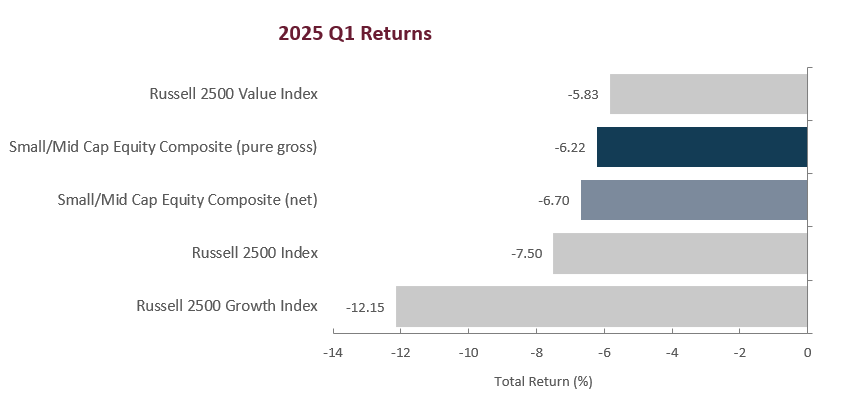 The volatility observed throughout 2024, persisted into the first quarter of 2025. The Russell 2500 Index declined -7.50% during the quarter, following a strong 2024 with the index returning 11.99%. After a moderately positive start to the quarter, February and March were a more challenging market environment due to uncertainty surrounding the precise parameters and implementation of the new administration’s policies, geopolitical tensions and a higher for longer rate environment. Continued economic growth, a stable labor market and firmer inflation data kept the Federal Reserve (Fed) on the more hawkish course they took in December. Chairman Powell held rates steady at the March FOMC meeting and indicated the Fed will maintain a more measured approach going forward, updating their economic projections and forecasts to two rate cuts in 2025.