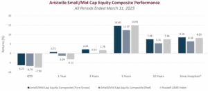Past performance is not indicative of future results. Composite returns are presented pure gross and net of the maximum wrap fee and include the reinvestment of all income. Pure gross returns do not reflect the deduction of any trading costs or other fees and are supplemental to the net returns. Net returns are calculated by subtracting the highest applicable wrap/SMA fee, which includes trading costs and custodial fees, from the pure gross monthly composite return (2.00% on an annual basis, or 0.17% monthly). Aristotle Small/Mid Cap Equity Composite returns are preliminary pending final account reconciliation. Please see important disclosures at the end of this document.
