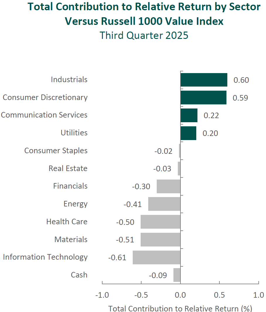 The portfolio’s underperformance relative to the Russell 1000 Value Index in the third quarter can be attributed to security selection, as allocation effects had minimal impact. Security selection in Materials, Information Technology and Health Care detracted the most from relative performance. Conversely, security selection in Consumer Discretionary, Industrials and Communication Services contributed. (Relative weights are the result of bottom-up security selection.)