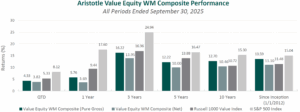 Past performance is not indicative of future results. Aristotle Value Equity WM Composite returns are presented pure gross and net of the maximum wrap fee and include the reinvestment of all income. Pure gross returns do not reflect the deduction of any trading costs or other fees and are supplemental to the net returns. Net returns are calculated by subtracting the highest applicable wrap/SMA fee, which includes trading costs and custodial fees, from the pure gross composite return. (From inception to 12/31/2015, the highest applicable wrap/SMA fee is 3.00% on an annual basis, or 0.75% quarterly. From 1/1/2016 to 12/31/2023, the highest applicable wrap/SMA fee is 2.00% on an annual basis, or 0.50% quarterly and 0.17% monthly from 1/1/2024 to present.) Aristotle Capital Composite returns are preliminary pending final account reconciliation. Please see important disclosures at the end of this document.